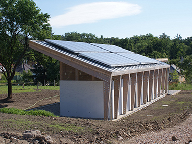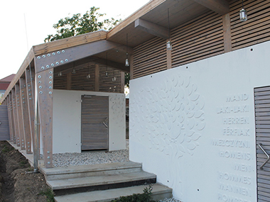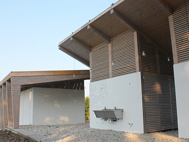A telek hátsó részén épült fürdőház rétegelt-ragasztott fa tartószerkezetű, látszóbeton falazattal. A falakra egyedi minta készült, mely a környezetre és a funkcióra reflektál. A projekt célja Zirc kulturális, és természeti értékeinek megőrzése, kulturális hagyományainak ápolása volt, összhangban Zirc város turisztikai fejlesztési koncepciójával.